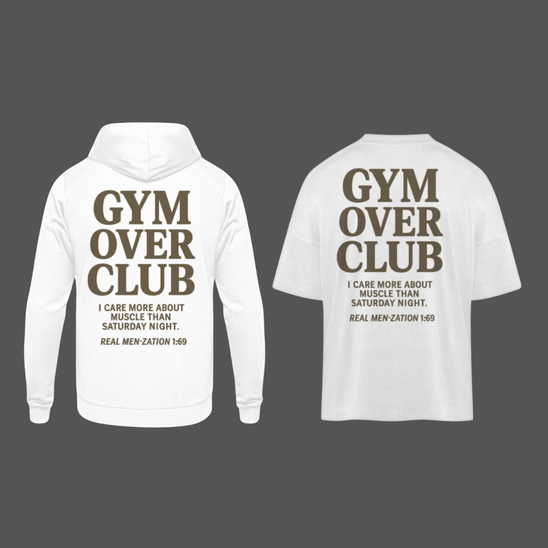 Das Gym Over Club Pack kombiniert Hoodie + Oversized Shirt zu deinem Statement-Look. Weiß oder Sand – clean, bold und ready für jede Session.